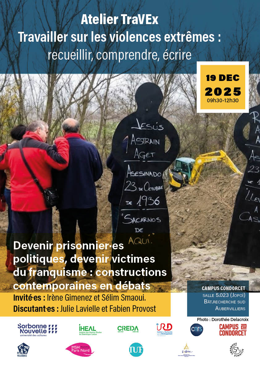 salle 5.023 (Jopoï), bâtiment de recherche sud | Campus Condorcet 5 Cr des Humanités, AubervilliersDate : 19 décembre 2025Horaire : 9h30 – 12h30Lieu : Campus Condorcet – Bâtiment Recherche Sud – Salle 5.023 (Jopoï) Titre de la séance Devenir prisonnier-es politiques, devenir victimes du… Poursuivre la lecture Atelier TraVEx – Travailler sur les violences extrêmes : recueillir, comprendre, écrire