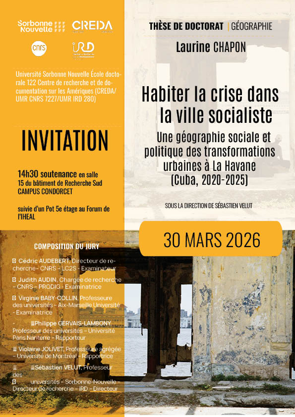 Le CREDA a le plaisir de vous annoncer la soutenance de thèse de doctorat en Géographie de Laurine Chapon. Informations pratiques Date : Lundi 30 mars 2026 à 14h30 Lieu : Campus Condorcet, Bâtiment de Recherche Sud, Salle 15. Convivialité : La soutenance sera suivie d’un pot au 5ème étage, au Forum de l’IHEAL. Titre… Poursuivre la lecture Soutenance de thèse de Laurine Chapon