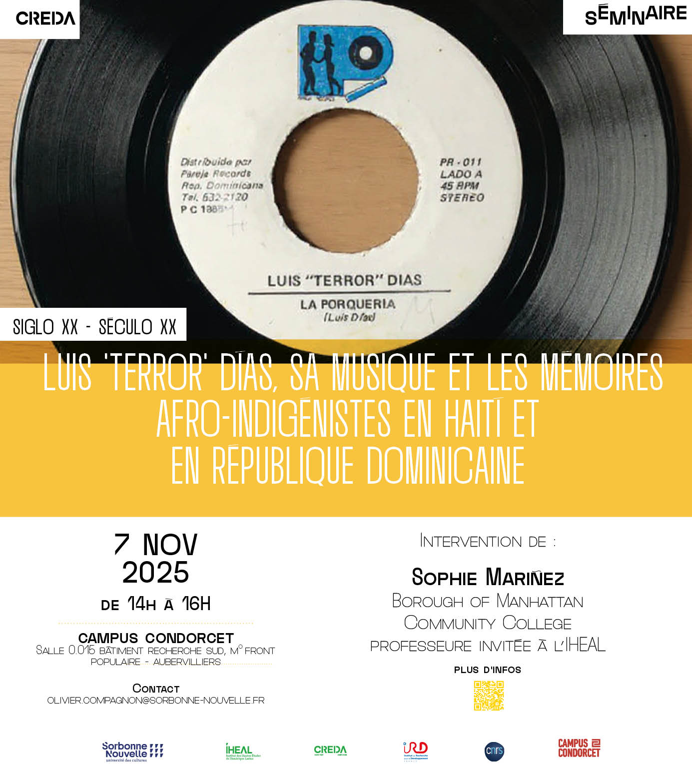 Dans le cadre du séminaire Siglo XX -Século XX le vendredi 7 novembre 2025 aura lieu l'intervention de : Sophie Mariñez (Borough of Manhattan Community College /professeure invitée à l’IHEAL)… Poursuivre la lecture Luis ‘Terror’ Días, sa musique et les mémoires afro-indigénistes en Haïti et en République dominicaine