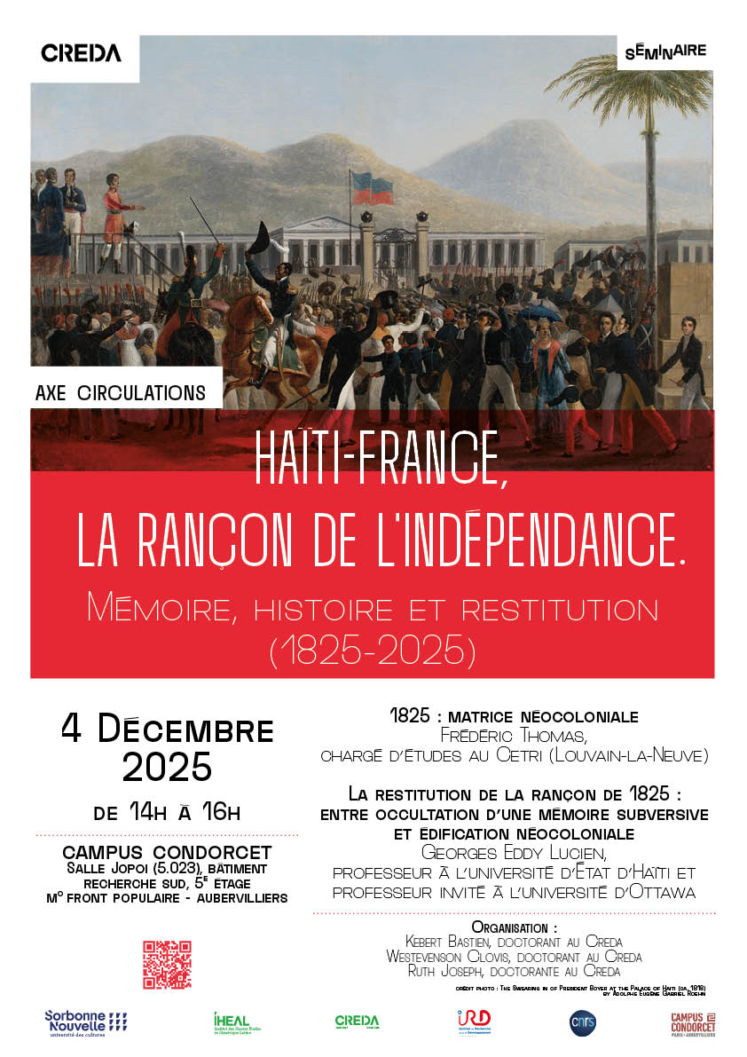 Cette séance s'inscrit dans l'Axe Circulations 4 décembre 2025 — 14h à 16hCampus Condorcet — Salle Jopoi (5.023), Bâtiment Recherche Sud, 5e étageMétro : Front Populaire – Aubervilliers Interventions •… Poursuivre la lecture Haïti-France, la rançon de l’indépendance. Mémoire, histoire et restitution (1825-2025)