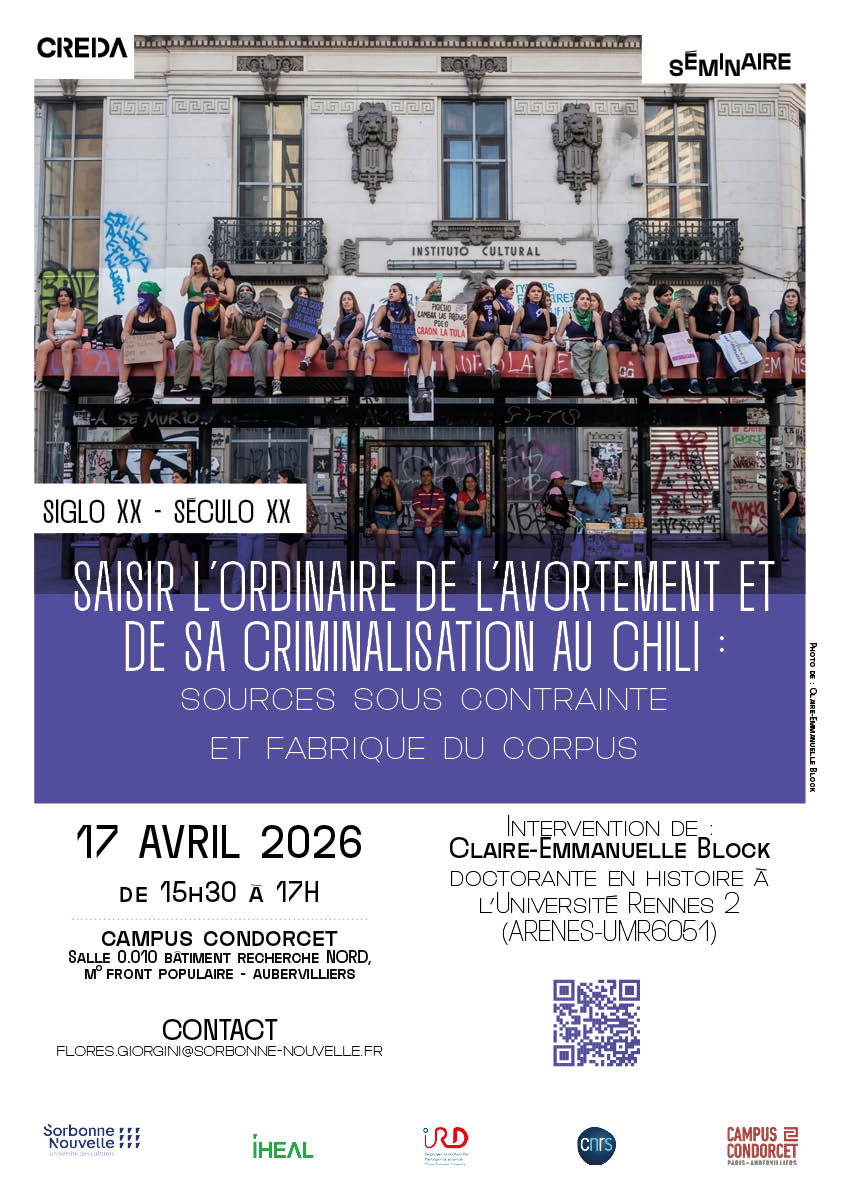 Le vendredi 17 avril 2026, de 15 h 30 à 17 h, le CREDA accueille la troisième séance du séminaire Siglo XX – Século XX. Nous aurons le plaisir d’écouter… Poursuivre la lecture Saisir l’ordinaire de l’avortement et de sa criminalisation au Chili : sources sous contrainte et fabrique du corpus