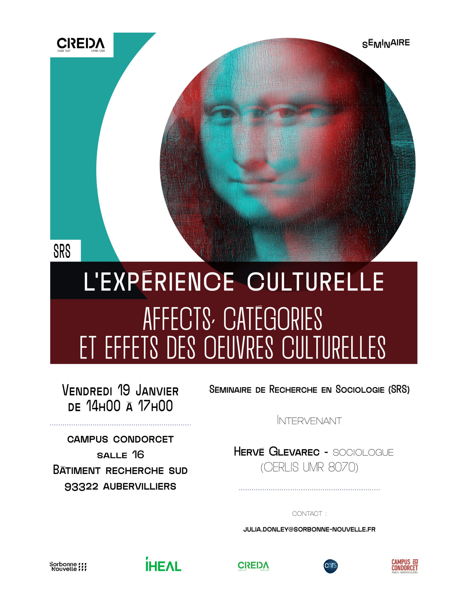 Séminaire de Recherche en SociologieL’expérience culturelle. Affects, catégories et effets des oeuvres culturelles.Intervenant : Hervé Glevarec – sociologue (CERLIS UMR 8070) Vendredi 19 Janvier de 14h00 à 17h00Campus Condorcet, Salle 16 Bâtiment Recherche Sud93322 Aubervilliers