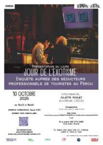 Dans le cadre du Séminaire Central du CREDA. Présentation du livre « Jouir de l’exotisme. Enquête auprès des séducteurs professionnels de touristes au Pérou », Editions La Découverte. Intervenante : Juliette Roguet